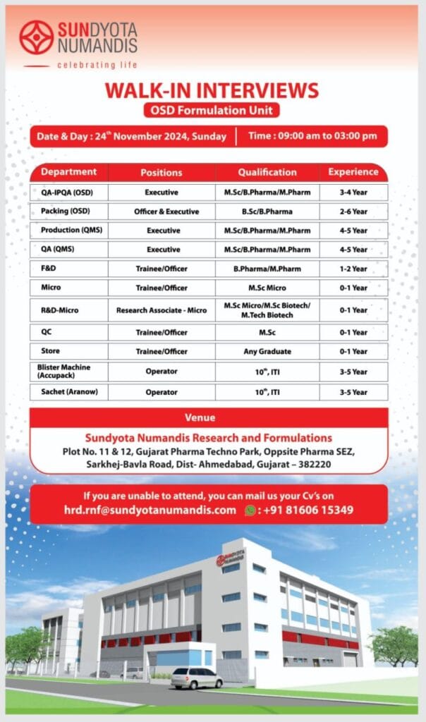 - Walk in Venue – Sundyota Numandis Research & Formulations, Plot No. 11 & 12, Gujarat Pharma Techno Park, Oppsite Pharma SEZ, Sarkhej-Bavla Road, Dist- Ahmedabad, Gujarat – 382220.