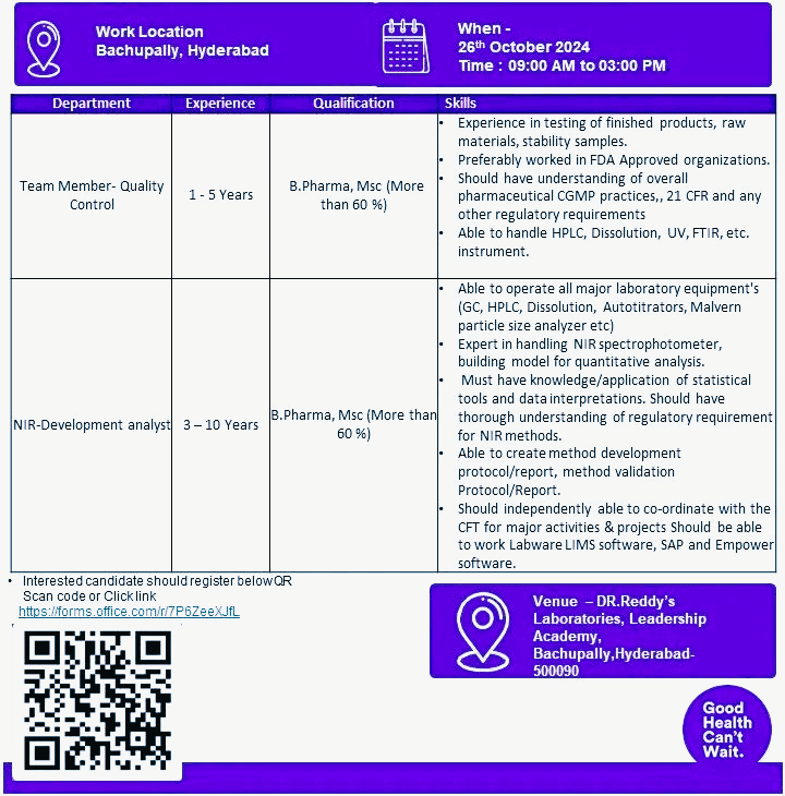 - Walk in Venue – DR.Reddy’s Laboratories, Leadership Academy Bachupally,Hyderabad-500090